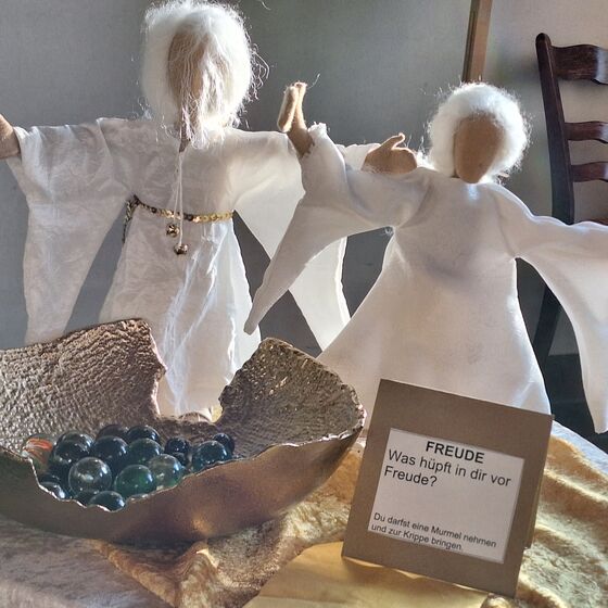 Die Familiengottesdienstteilnehmenden hatten die Möglichkeit, an den einzelnen Stationen, symbolisch für die eigene Sehnsucht und die derzeitige Befindlichkeit, Scherben, vertrocknetes Laub oder bunte Murmeln in die Krippe zu legen. Der helle Kerzenschein in der Krippe hat alles mit seinem Licht umhüllt.